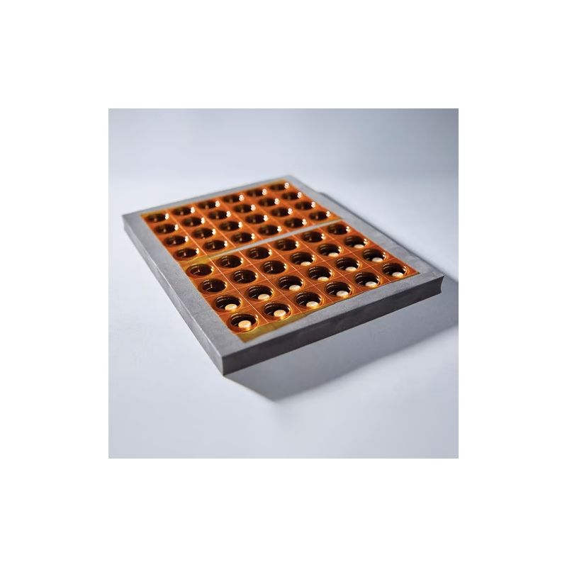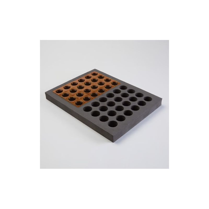 Support en mousse destiné au maintien des tablettes de conditionnement, afin de faciliter le collage des étiquettes.